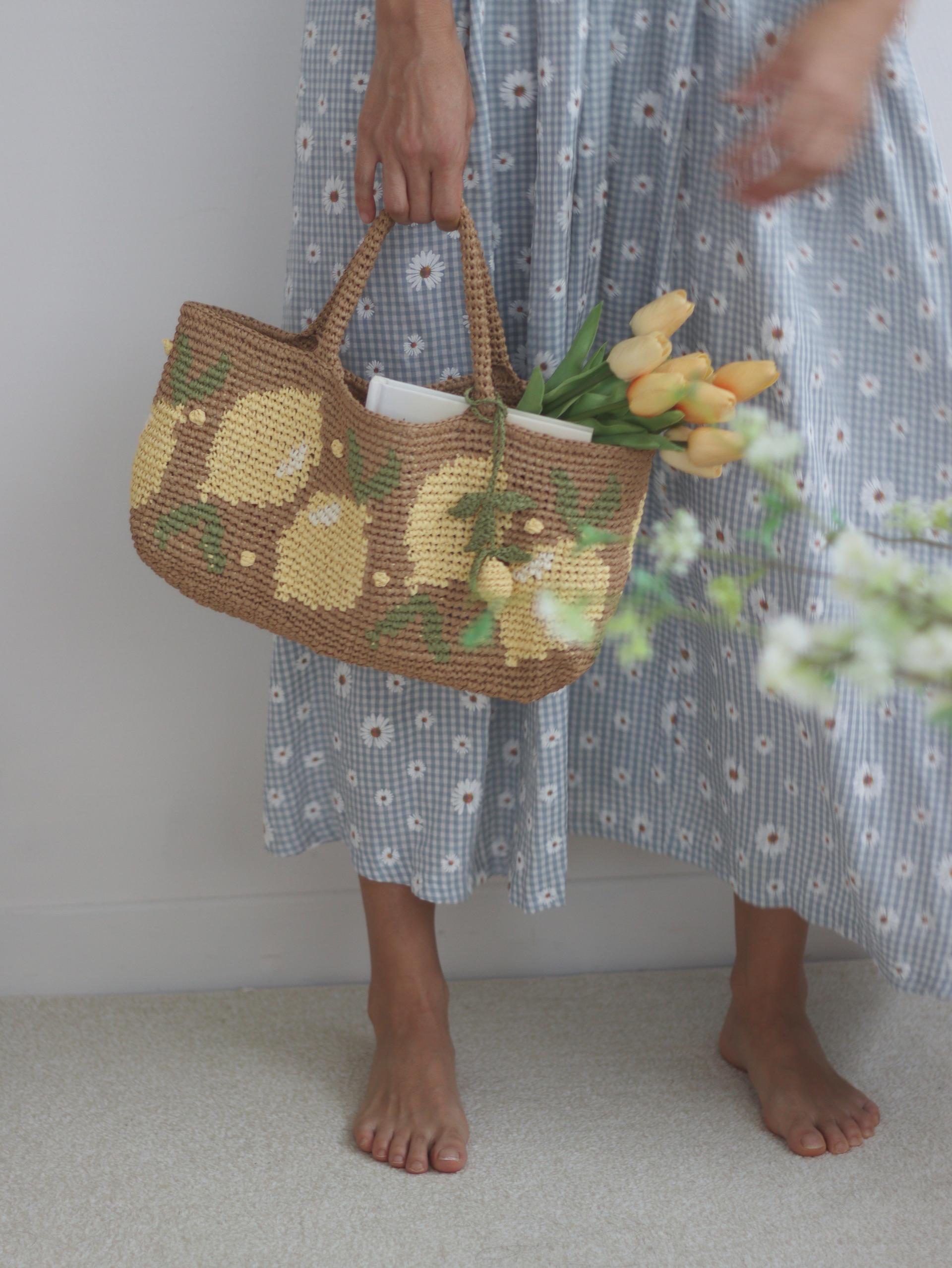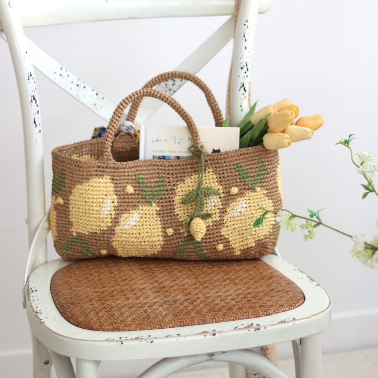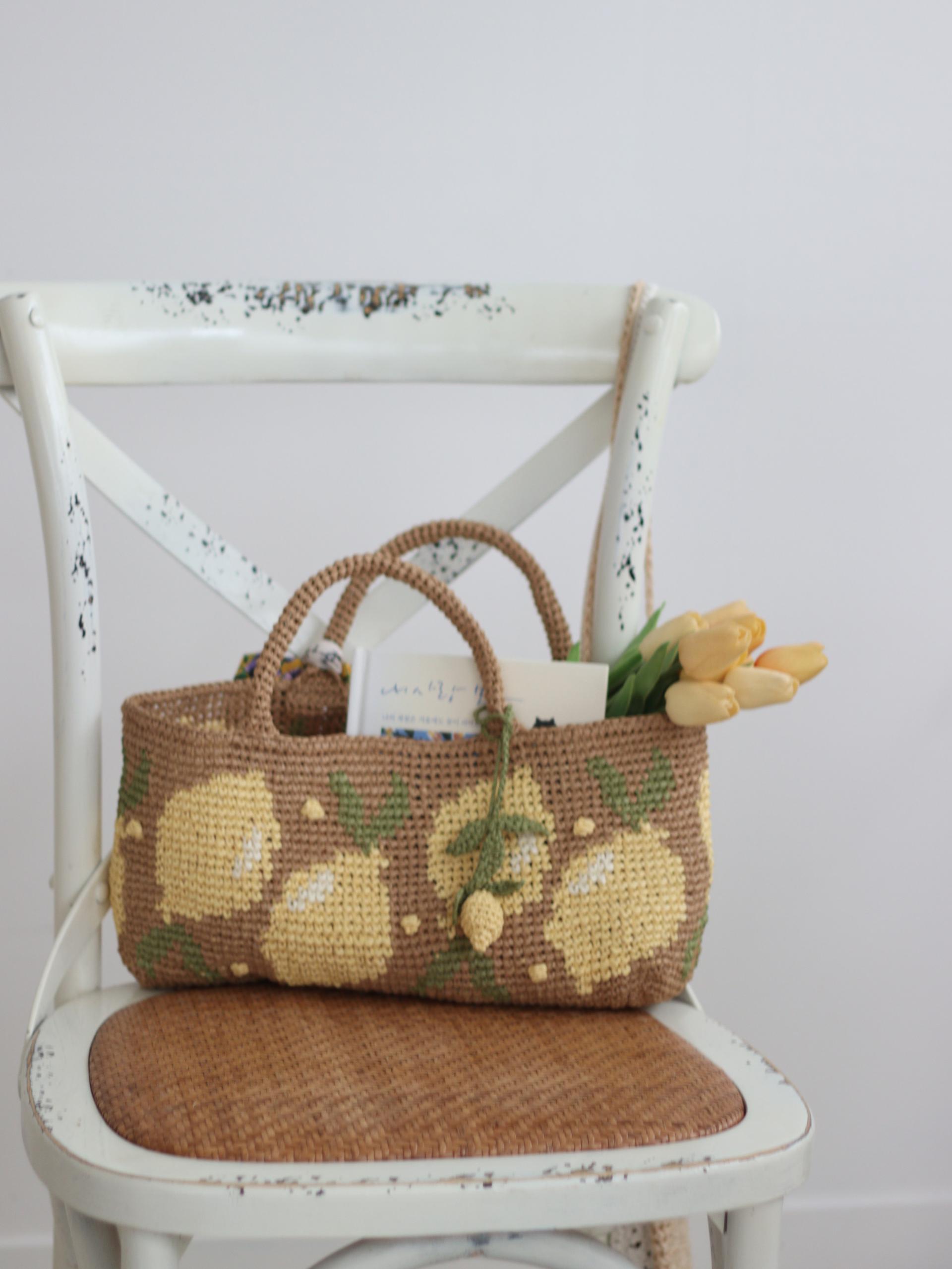 짧은뜨기 배색 기법으로 뜬 레몬팝 바스켓 백입니다.