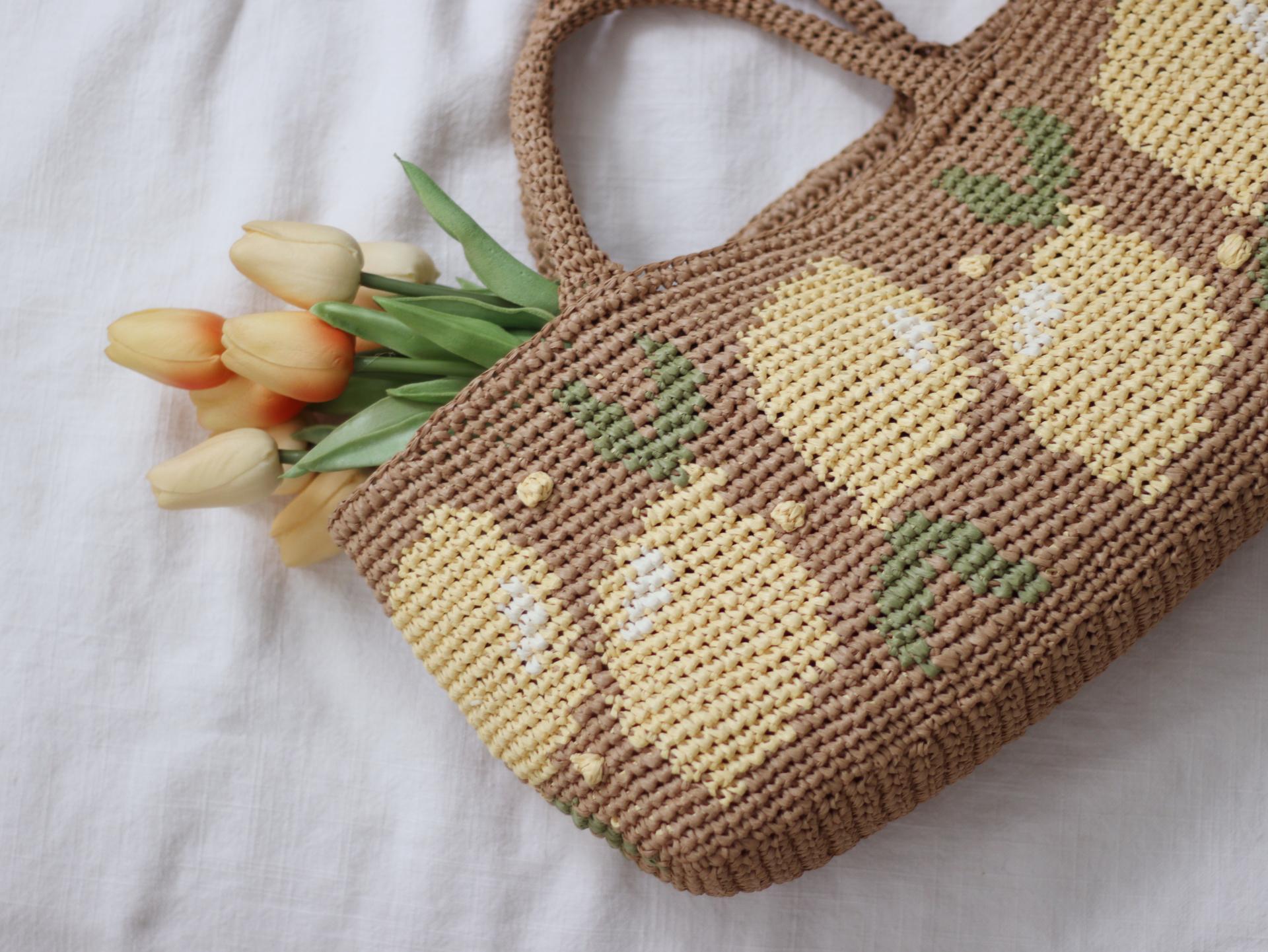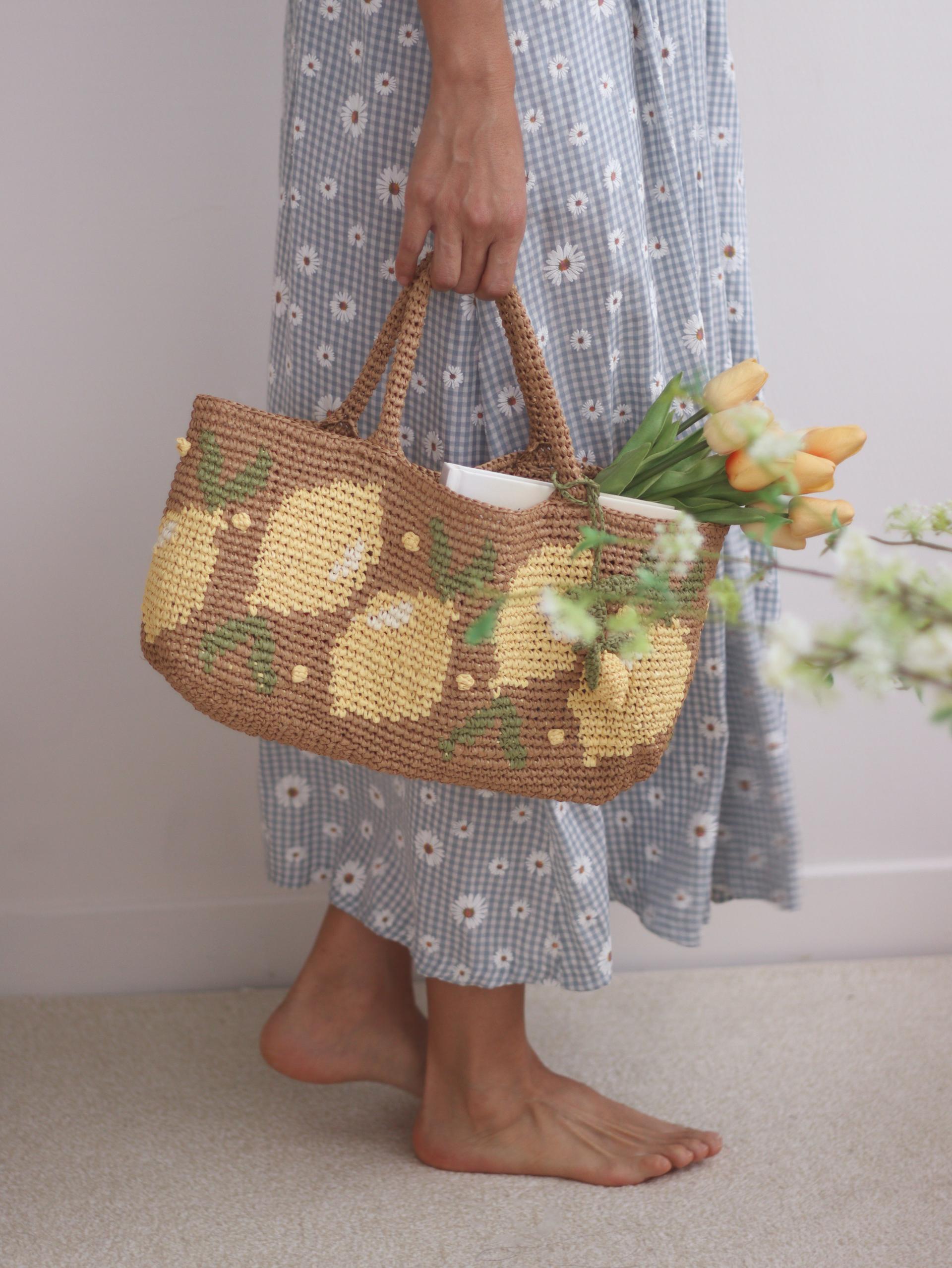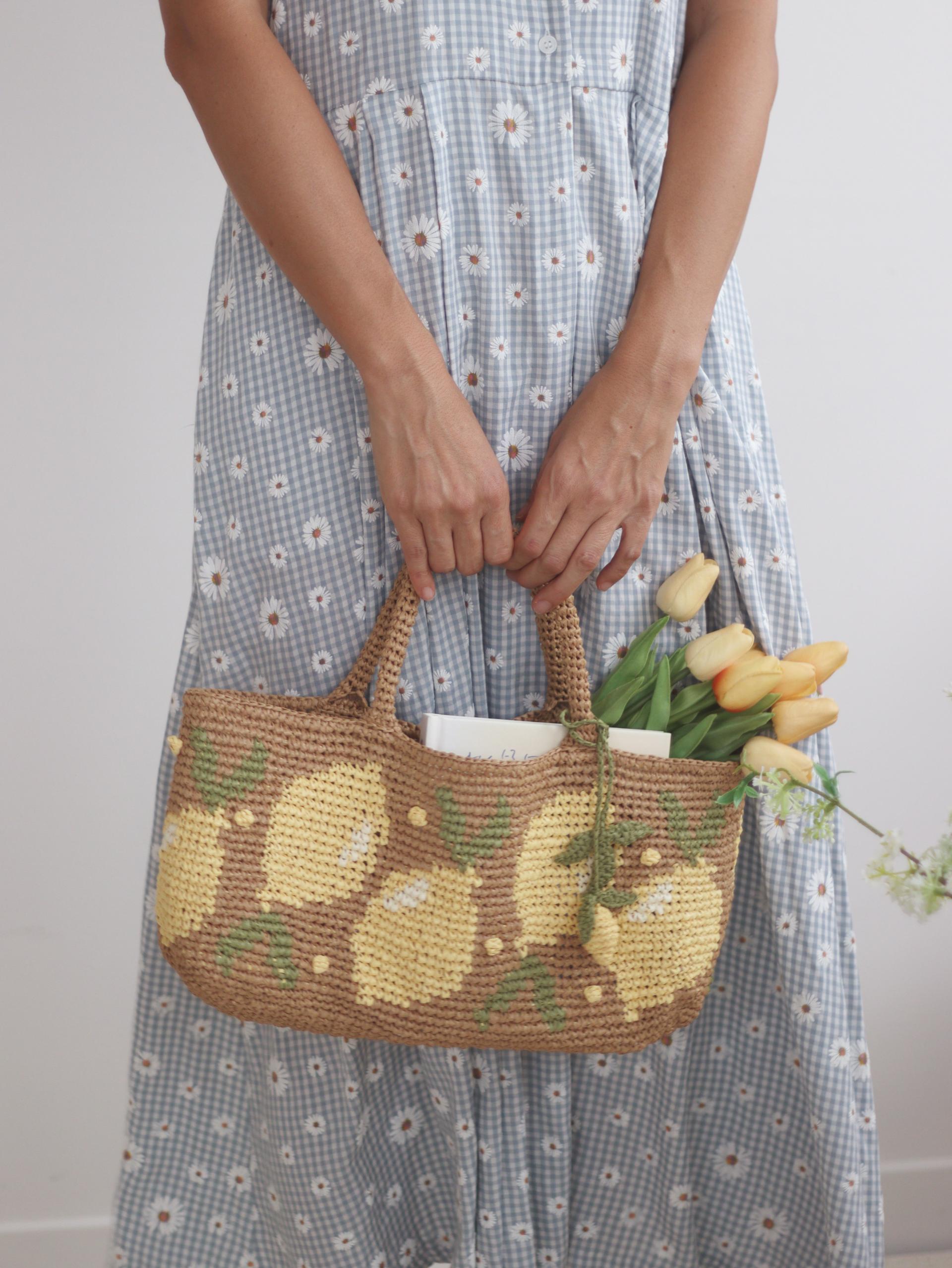 짧은뜨기 배색 기법으로 뜬 레몬팝 바스켓 백입니다.